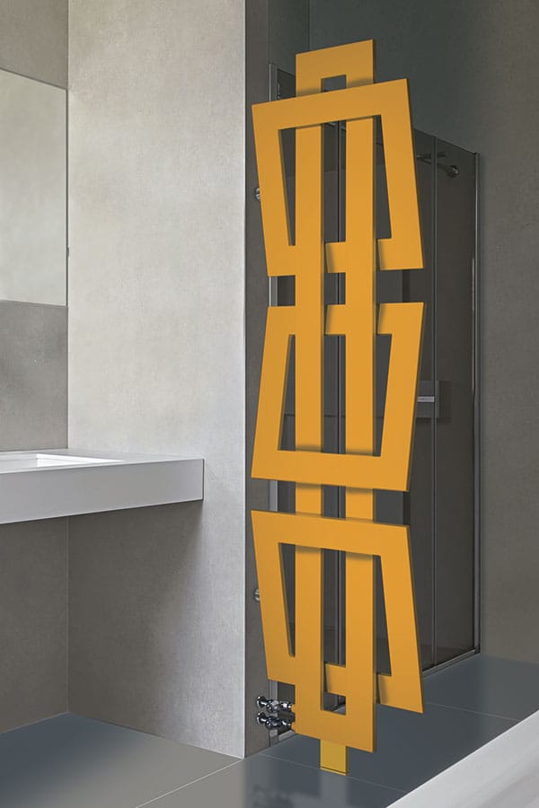 Interwoven squares and rectangles to create a radiator with an unusual look. Can be used as a towel-heater, or simply a decorative feature in any room. The geometric shapes can be multiplied at will, always resulting in a harmonious whole